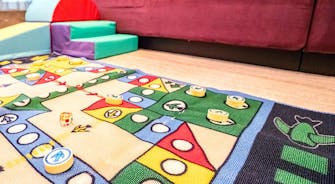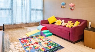 Step into a magical family suite adorned with friendly unicorns, colorful flowers, and puffy clouds on the sofa. A cozy tent with a cuddly bear creates the perfect hideaway for children to unwind. The room offers soft play areas featuring plush cushions and engaging toys. Your little ones will delight in discovering every corner of this enchanting, wonder-filled space.