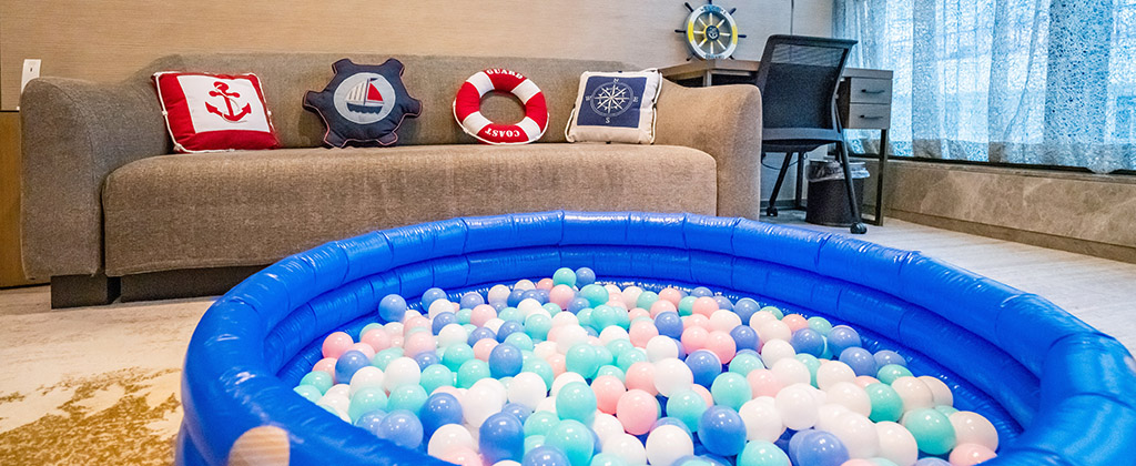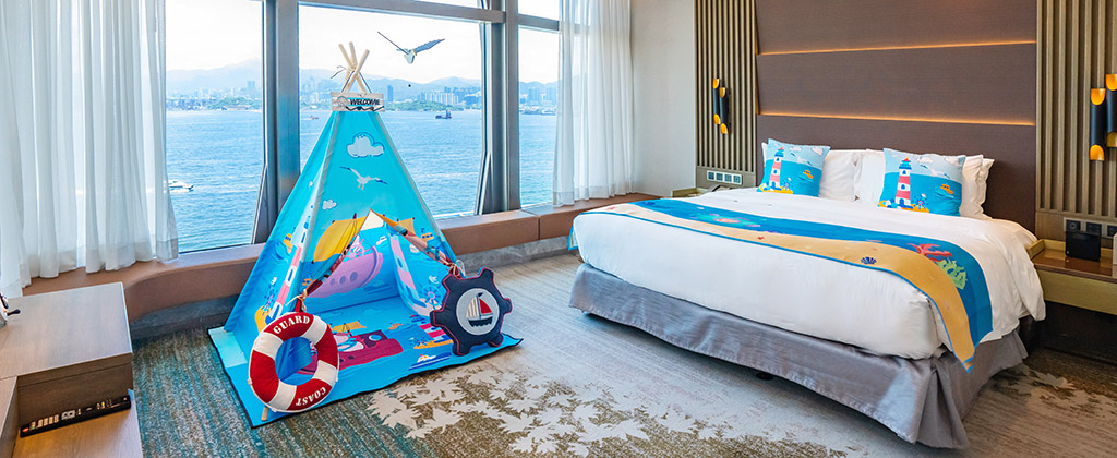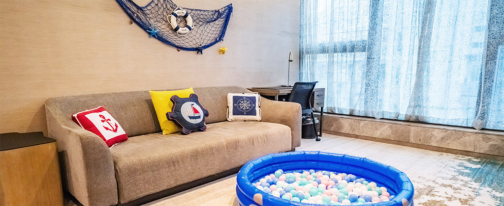 Our family theme room immerses you in the maritime atmosphere of bustling Victoria Harbour. Young explorers will delight in the ball pit, while imaginative decorations—vibrant fishing nets—adorn the walls, creating an enchanting space.